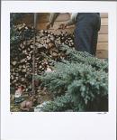 Image of a man (cropped at the waist) collecting firewood from a pile of logs.