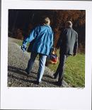 Man and a woman with a child, image taken from behind, as they walk along a path.