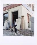 Image of a dog outside a stonemason shop.