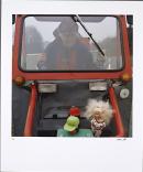 Man in a tractor with toys resting on the hood.