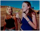 Girl with parrot perched on hand, who pecks at a biscuit in her mouth. Another girl looks on, laughing.