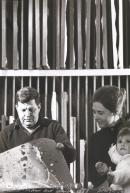 Fred Williams looking at painting in studio with woman holding baby next to him.
