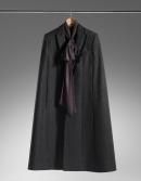 Three quarter length charcoal wool Cape in A-line shape, with V-neck jacket collar and thin lapels. The shoulders are slightly padded with a sharp narrow shoulder line. There is a single button fastening at centre front. The wool is overprinted with flecks of white.