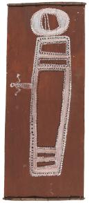 Bardayal Nadjamerrek was born around 1926 at Kukkurlumurl, in the Country of the Wurrbbarn clan. Bardayal was taught to paint on rock by his father, Yanjorluk, and painted on bark from about 1960. This work is a depiction of the Ubarr ceremony, which is a major regional ceremony last performed in 1979 at Oenpelli.