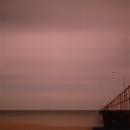 Image of a pier, stretching out over ocean, with vast pink skyscape. Framed