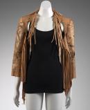 Woven kangaroo leather sleeves with high collar, shoulders and fringing. The sleeves are formed from a solid piece of leather tattooed with fine line drawings of cherubs, birds and scrolls, loosely inspired by Baroque art. The loose woven ends form a decorative fringe from around the neckline and shoulder descending down centre front.