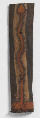The rectangular dance shield by artist, Woris from the Eastern Highlands Province depicts a snake - an important creation spirit. Designs such as this one are very similiar and closely linked to those on cave paintings, which is used on shields and bark paintings.