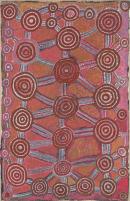 This painting illustrates the Dreaming of two brothers, the elder being a quoll (mistakingly labeled native cats since colonisation) and the younger being a possum. They were scared to go hunting in the day, preferring to venture out at night. The Possum Boy was blind, but the Native Cat Man had good eyesight, allowing him to hunt well enough for them both. One night they misjudged the time and were still out at dawn. The Native Cat Man ran into a cave to hide and the Possum Boy duly followed him. They remain in the cave today.