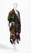Digitally printed, wool jersey dress with scooped neckline and long narrow sleeves finishing at mid-calf. The dress features an abstracted, floral pattern of muted fluorescent colours against a dark grey ground. Cut so that there is no wastage, the dress incorporates the excess fabric, which is draped from behind to form a neck cowl and long drapery down centre front. There is a separate woven cotton belt which is held at the waist with belt loops.