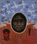 inscribed in crayon on reverse u.l.: Federation Series; / ‘Mollie’ / by / Julie Dowling (D underlined) / May 2001 / Acrylic, Red Ochre and / Plastic on Canvas / ~ / This painting shows my g (crossed out) / grandmother Molly (y overinscribed with ie) Dowling / during the bombing of Broome and / Derby in the 2nd World War. / 1940–1950
