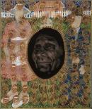 inscribed in crayon on reverse u.l.: ‘Federation Series: George’ / 1950–1960 / by / Julie Dowling / May 2001 / Acrylic, Red Ochre and Plastic on Canvas / ~ / This shows my great Uncle George / Latham who always ran away from / Native Welfare. He lived in the / bush by himself from the age of 15 (5 overinscribed with 0) / because many of his mates and / family were put into ‘care’. When / he got older he stopped some / kids from being taked for a time / He remembers the fifty’s like it was / yesterday.