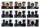 Series of nine photographs of three people whose faces are gradually obscured by painted calligraphy.