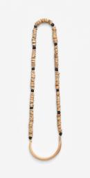 The necklace is of a polished lip of a trochus shell combined with ground-down bases of cone shells interspersed occasionally with small banana seeds.