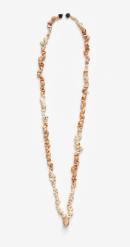 The necklace is of fragments of salmon pink and white sea snails with an immature cowrie or maybe bailer as the centrepiece finished with the seeds from bush bananas.