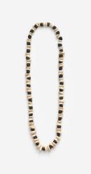 The necklaces are of pairs of the bases of aged worn conus and cowrie shells alternated with banana seeds.