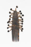A decorative hair comb with holes at the outer rim with some 19 or 20 tassels; each with five or six small shell discs topped off with a banana seed. This hair comb is engraved with the unique Oro pattern or 'arrow heads' or 'chevrons' which are sometimes carved into lime spatulas, headrests and traditional clay pots from Oro Province.