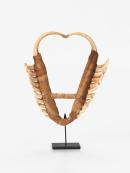 This 'war or peace' mask - the cross bar of which is held in the teeth, was collected from Tufi people, Oro Province in 2003. The manner in which the mask is gripped in a warrior's teeth indicates the intent of the warrior. If the pig's tusks are pointing towards the wearer, then he is indicating he is visiting a village for peaceful purposes, however, should the tusks be pointing forward then beware, the warrior has announced he is entering to settle a score. The foundation material is of light wood, to which the pigs' tusks are attached with the frame wrapped in bark cloth. An example of this mask is in the photograph of 'Sokiram' opposite page 339 of Arthur Kent Chignell's 'An Outpost in Papua' published by Smith, Elder and Co in 1911. (21 x 16 cm)