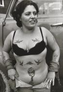 Image of a woman standing in front of a truck wearing a bra and unzipped jeans, body covered in tattoos.