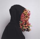 Profile portrait (facing to right) of person wearing black hoodie, with red flowers pouring from the hood.