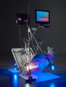 table, ironing board, mop, fans, colour television monitors, video cameras, light globes, electrical cords, found objects