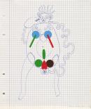 blue ballpoint pen and collage of colour paper stickers on graph paper