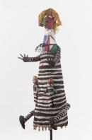 The large conical figure is covered with horizontal black and white stripes, with arms and legs outstretched to face the viewer, has hair of yellow moss, and two small figures issuing from its abdomen.