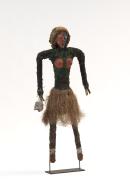 The female Temar figure in frontal pose carries a skull in her right hand, wears a grass skirt and has red and blue facial markings echoed by her male companion.