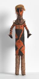 This two-headed Temar by Mansak's family from Ranupupre represents a pair of ancestors, either members of the same grade society or twins. The standing figure is striped with a shock of orange pigment on the abdomen.