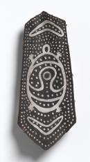 Unlike Kwoma bark painting, which are painted on one side of the bark, these West Papuan bark sickness shields are made by tying or sawing two flat and pressed base portion of sago palm stem, forming a container used as storage for storing bush medicine. Both sides of the barks are painted with dots, lines and zoomorphic figures depicting 'spirit animals' which is believed to have brought sickness to the village. The shields are fastened to the walls of one of the houses in the village to ward off further dangerous attacks from sickness spirits.