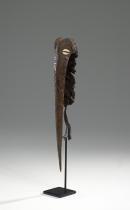 Bone daggers vary substantially in quality and form, the ritual bone dagger is decorated with carved motifs and anthropomorphic figures. At the high end of the dagger are two shells embedded on either side representing eyes creating a bird-like face. A stand of fibre tassel hung in the centre of the high end completes the decoration.