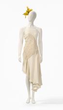 Strapless cream satin dress with asymmetrical hemline. The front is smocked between under bust and lower hip, drawing up the fabric into a draped fullness at the right proper hip. The dress fastens centre back with an invisible zip.