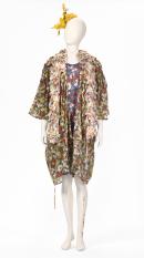 (a) The loose flowing jacket reaches to below the knee and is printed in a mustard, green, red, purple, cream and gold floral and geometric design. The fabric across the back shoulders and sleeves has been hand stitched into shibori tied rosettes.
