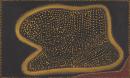 Thomas has painted Yunurr, near Spring Creek junction in Gija Country, on Texas Downs Station where he worked as a stockman, mustering cattle. There is a long hill at Yunurr where an ancestral snake travelled in the ngarrangkani (Dreaming) and made a spring by urinating. In the centre of the work, Thomas represents Red Fire or Kilfoyle Hill as a rounded, squarish shape bearing loose yellow dotting that stands out on a black ground. The red-ochre angular section in the bottom left corner indicates the road for cars near the hill.