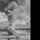 Ben Day dots fire (physical concept) men (male humans) monochrome news photographs newspaper clippings roads rock (inorganic material)