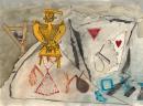 fibre-tipped pen, enamel paint, synthetic polymer paint, colour pencils and collage of torn yellow paper, gelatin silver photograph and masking tape, polyvinyl acetate