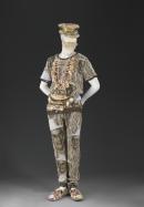 cotton and metallic yarn, metallic paint, plastic and shells on synthetic material and vinyl, synthetic fleece lining, nylon lace, cotton thread, elastic, adhesive, varnish, synthetic thread, metal