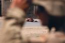 Distant view of a deceased man, as seen through the arms of a US soldier.
