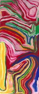 Kunawarritji on the Canning Stock Route is an important rockhole near the artist’s birthplace. It was made in the Jukurpa (Dreaming). The little hills around the area were all squeezed out of the soft earth. The Minyipuru (Seven Sisters) are still standing up as a group of trees between Nyipil (Well 34) and Kunawarritji. These ancestral beings are the stars in the sky. The sweeping contours represent tali (sand hills) that dominate the topography of this vital water source. This is good country for collecting pura (bush tomato) and kantjilyi (bush raisin). The circular shapes indicate rockholes, places of living water that punctuate the desert.