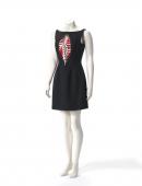 Sleeveless short black dress with front inset panel enclosed with metal zip of screenprinted rib cage. Constructed from eight shaped panels. Lined with red acetate.