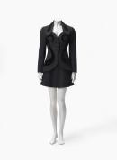 (b) Short flared skirt with welted pockets angled either side of front and trimmed with velvet. Fastens with a zip at centre back. Pink lining with ruffle along lower edge.