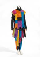 (b) Reversible multicoloured silk patchwork shirt with zigzag shawl collar.