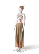 In her early collections, Jackson used a selection of vintage fabrics - printed cotton and luxurious silks - to create sundresses, playsuits and evening wear with a nostalgic twist. Dying rose has been created out of vintage sunray crepe, and the accordion pleats reflect the influence of mid-twentieth century design on Jackson’s artistic practice. The asymmetrical dress features a delicate image hand painted by Charlotte Barnes which she painted on fabric that had been pre-cut by Jackson.