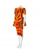 Outfit of orange cotton appliquéd all-over with Sturts Desert Peas and red lips. Comprises apron top, crop top, short skirt and ¾ pants.