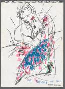 coloured pencils, coloured fibre-tipped pens, red and blue ballpoint pen