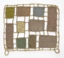 Ten small pieces of silk, cotton and linen hand-dyed with natural dyes in shades of soft brown, green, blue, cream and yellow; linked together with connecting cream threads in a grid-like pattern to form a square. Two loops along top edge.