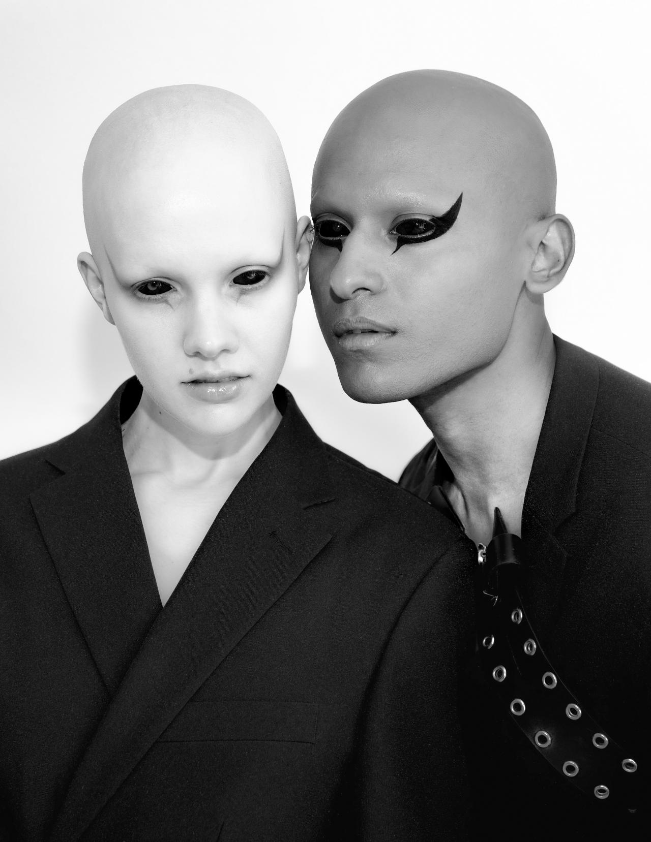 Multi-disciplinary Canadian brand Fecal Matter was established by designers Steven Raj Bhaskaran (b.1993 in Canada) and Hannah Rose Dalton (b.1995 in New Zealand). The pair bonded over a passion for uncensored ideas and critical design thinking; the name of their label is a direct comment on fashion’s cycle of consumption and the emptiness of materialism. Key to their practice is the rejection of restrictive beauty standards and gender binaries. Using social media as a platform, Bhaskaran and Dalton construct a unique otherworldly aesthetic that questions what it means to be human via the use of photography, hair, make-up, clothing and prosthetics. Their work is featured on their Instagram account: @matiersfecal.