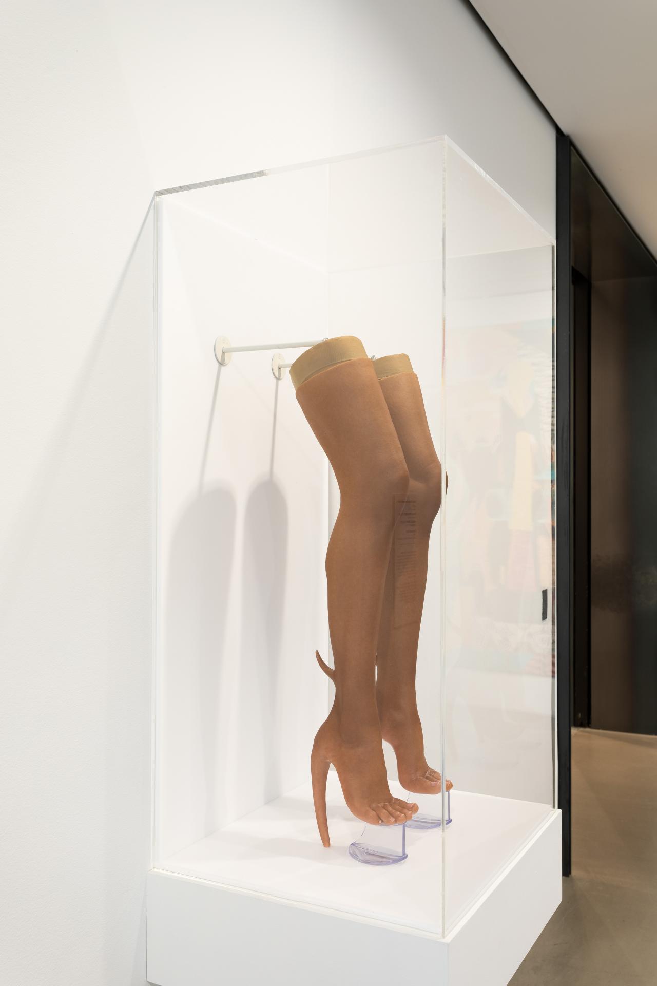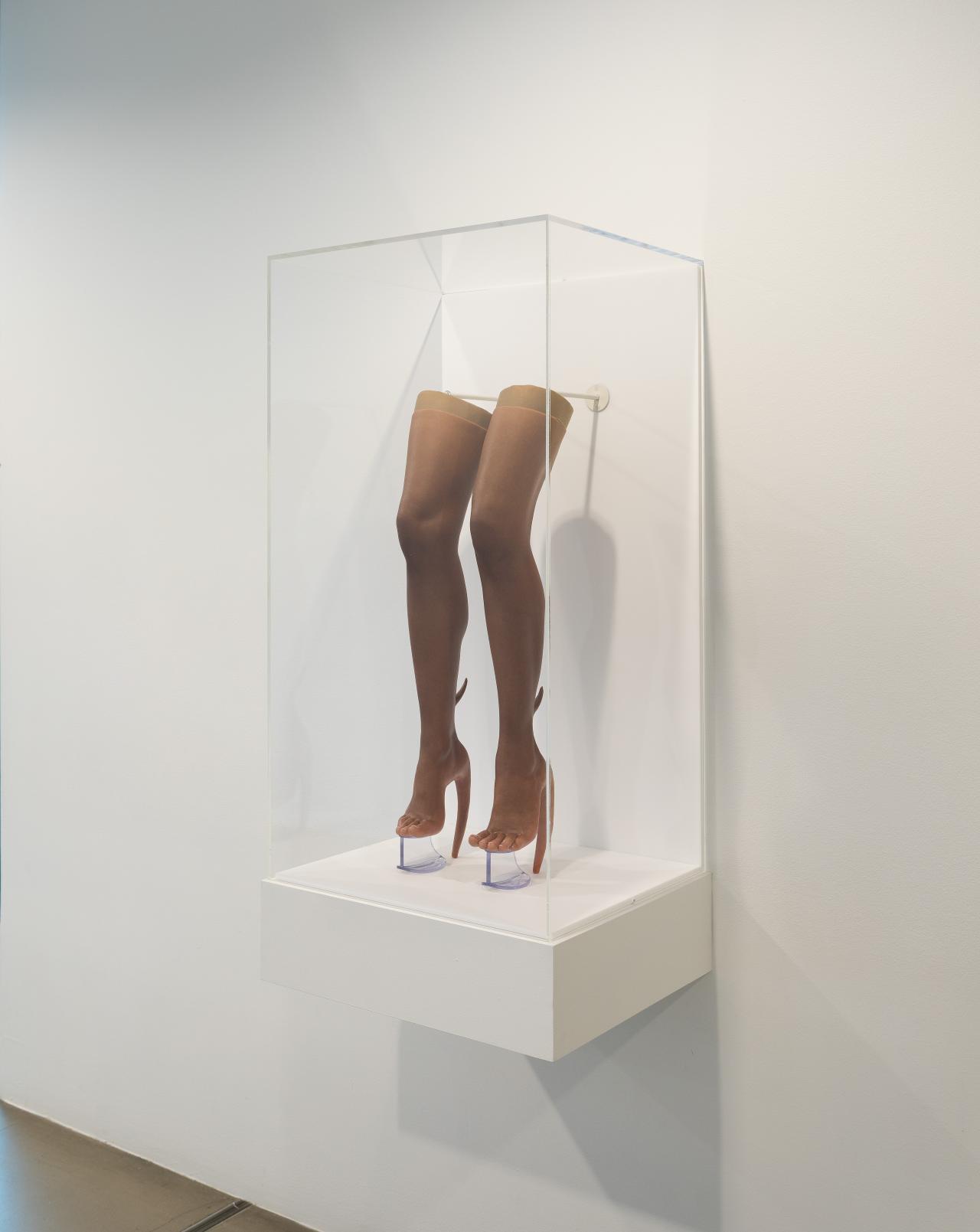 Commissioned for NGV Triennial, Skin heel boots 2020 is an outcome of Fecal Matter’s interest in non-surgical forms of body modification to imagine a post-human identity. Fabricated through a moulding and painting process in collaboration with artist Sarah Sitkin, the boots comprise a hyper-realistic silicone ‘skin’ grafted onto an elevated Perspex platform. Only here the realism of toes, ankles, knees and leg muscles is counterbalanced by physical mutation: short sprouting horns and fleshy towering heel extensions. In this sense, Skin heel boots can be understood as a means of translating the freedom of the digital realm, where the self can be manipulated and edited easily and endlessly, into the offline. For Fecal Matter, fashion is a way of challenging normative social and gender roles and speculating on what it means to be human. It underscores their daily message ‘be whoever you want to be and live freely’. Be transformative.