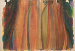 The Colour-Field painters, championed by Mark Rothko and Morris Louis, were known for their large planes of colour and deep attraction to myth and spirituality. Characterised by compositions involving broad areas of a single colour, these fields of rich pigment intended to evoke a contemplative state in the viewer. Artists usually apply pigment or paint on the prepared surface of the canvas to create an image. Morris Louis negated this by making the surface and paint collapse into one. He used dyes and thinned acrylic washes to soak and embed pigment within the raw, unprimed fibres of the canvas. |