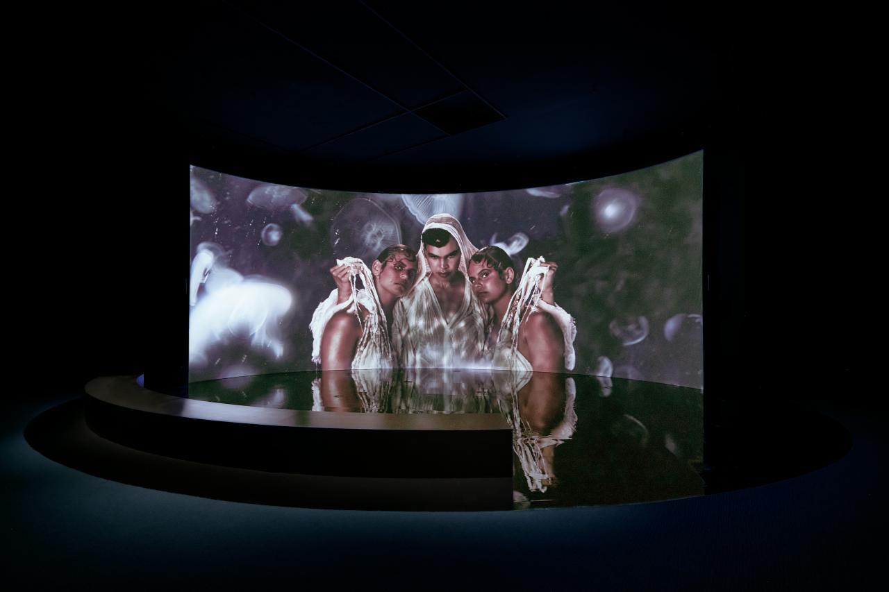 Hannah Brontë’s immersive video installation EYE HEAR U MAGIK 2020 explores how ancestral intuition has been passed down through Aboriginal people in the wake of colonisation. She uses music and film to unblock intuitive beliefs and tune into a deep sense of knowing, which she refers to by many names including ‘the knowing’, ‘the cunning’ and ‘illpunja’. Offering a foreboding sense of the future, the work explores the ways in which Brontë’s culture and spirituality have been and continue to be appropriated. It is Brontë’s most ambitious video to date and her first commission by the NGV.