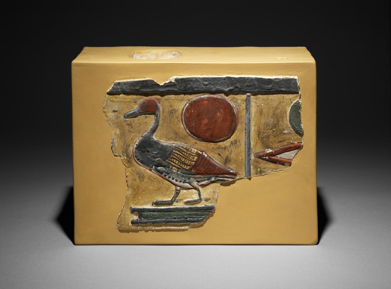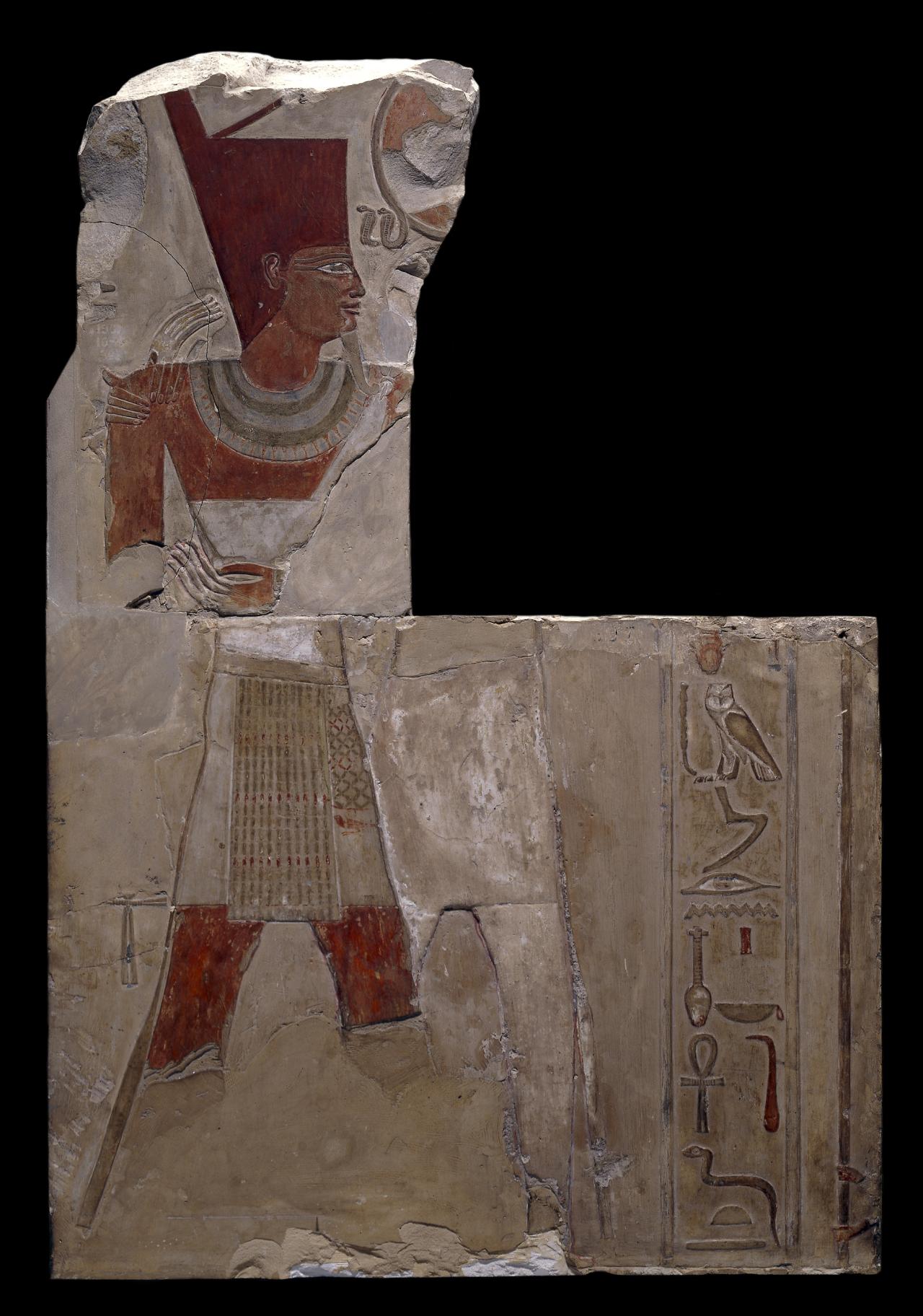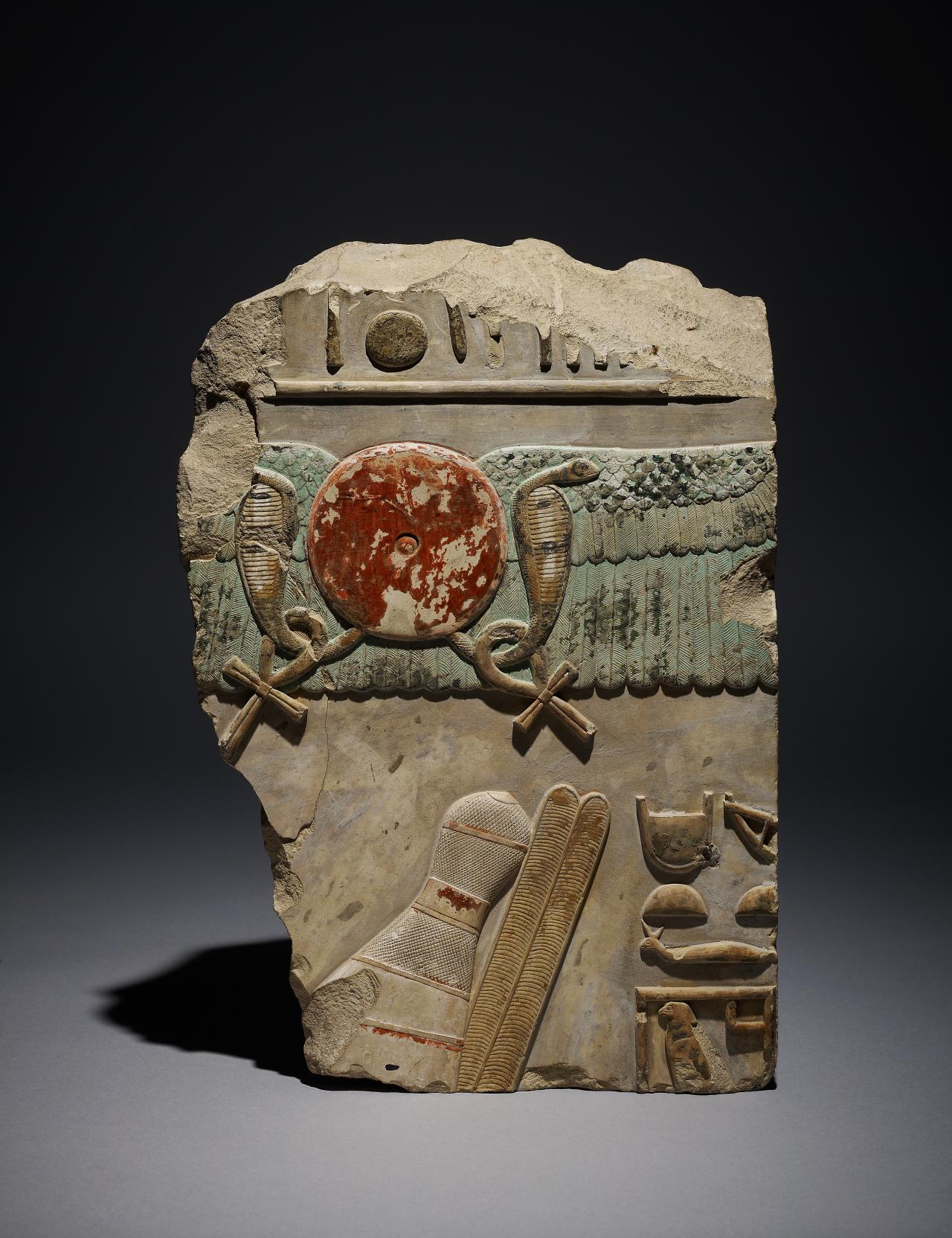 The sun-god provided the king with life, protection and power. On this fragment, Mentuhotep II is protected by a winged sun-disc flanked by two uraei (rearing cobras) and ankh (life) signs. Only the top of the king’s crown is visible, seen below the sun. The inscription at the bottom right suggests that the king was originally depicted with one of his wives.